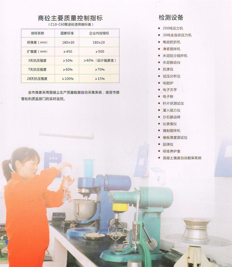 公司設(shè)有先進的實驗室,配備全套混凝土及原材料檢測試驗設(shè)備,配有專職的試驗、檢驗人員,可承擔混凝土的材料性能試驗,工藝質(zhì)量控制、產(chǎn)品質(zhì)量檢驗等全部試驗、檢驗項目,為確保混凝土質(zhì)量提供了可靠的保證。
